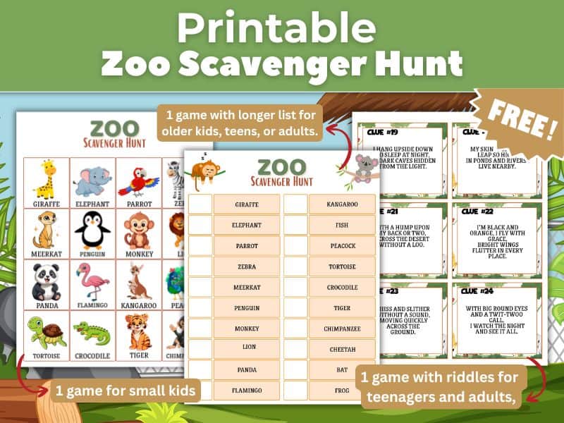 We’ve created three exciting variations of this free zoo scavenger hunt to suit every age and group size — from young children to older kids, teens, and even adults. It’s a great way to make your zoo visit educational and interactive without losing the fun. So grab your free copy of the zoo scavenger hunts, your zoo map, and your favorite animal book — let the adventure begin!